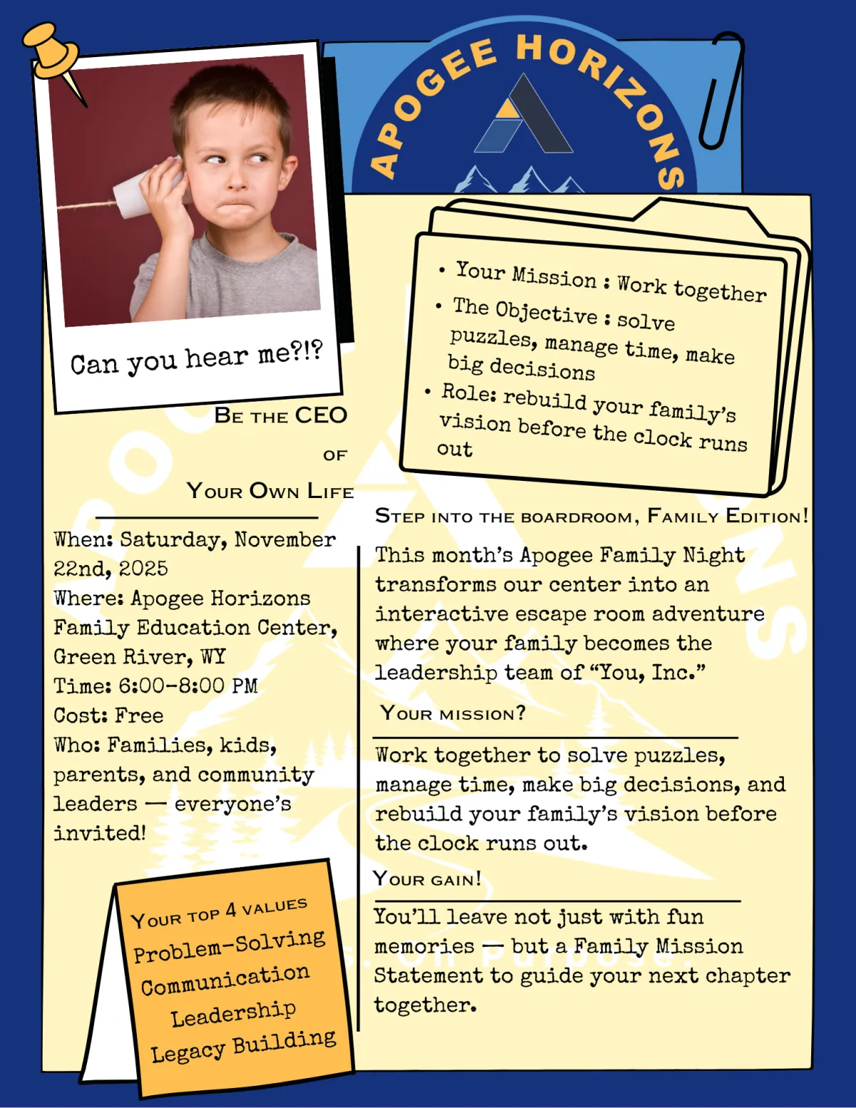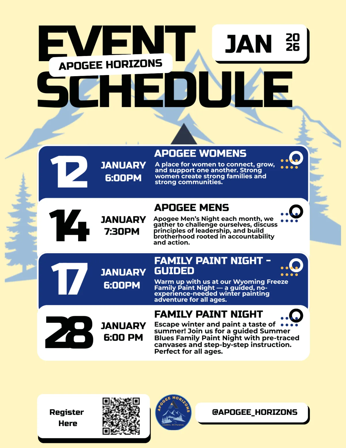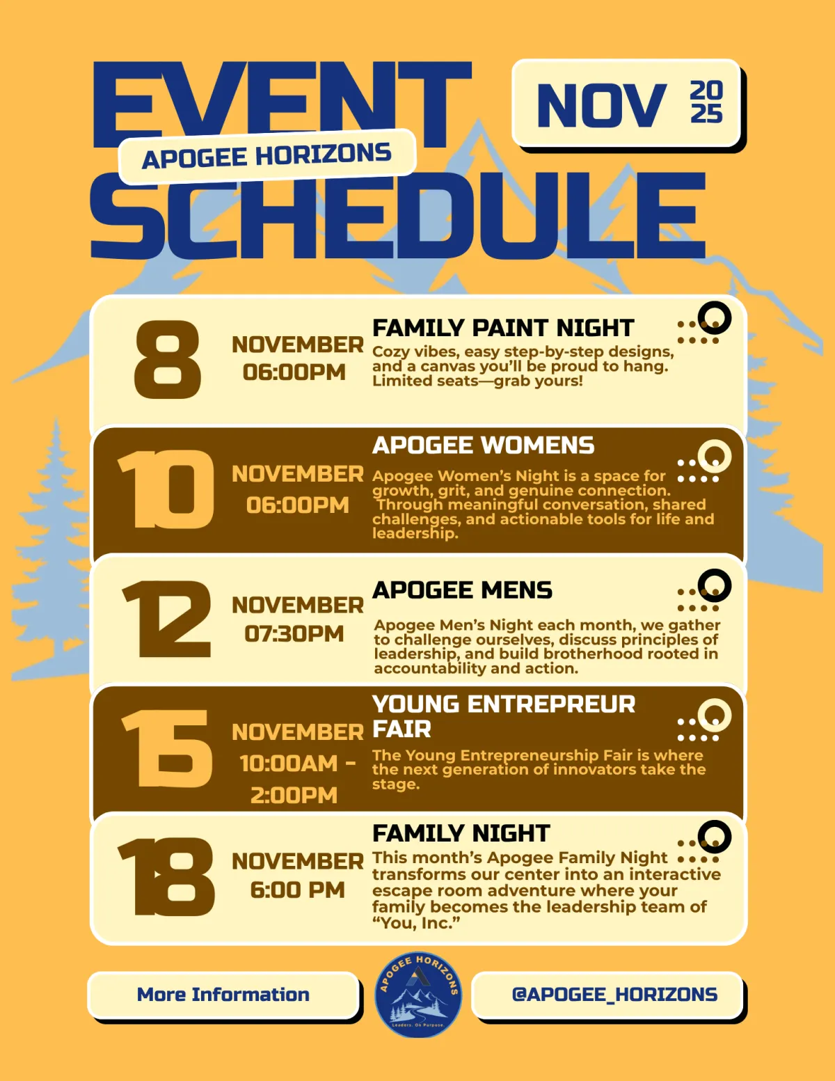 Our events are more than gatherings — they’re opportunities to strengthen families, build community, and live the values of the Apogee Code together.